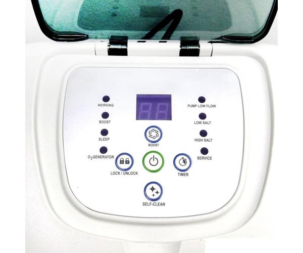 Оборудован электролитической решеткой, покрытой самоочищающимся титановым сплавом. Для удобства эксплуатации имеет 24-х часовой таймер и сенсорную панель управления, позволяющую задать режим работы в зависимости от размера бассейна. Для проверки работоспособности в комплект включены 50 тестовых полосок, позволяющих проверить химический состав воды по трем показателям: уровень свободного хлора, pH и щелочность.